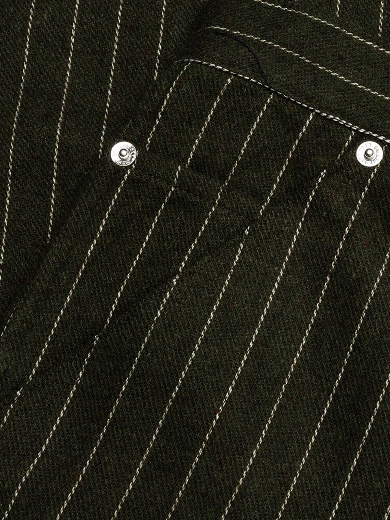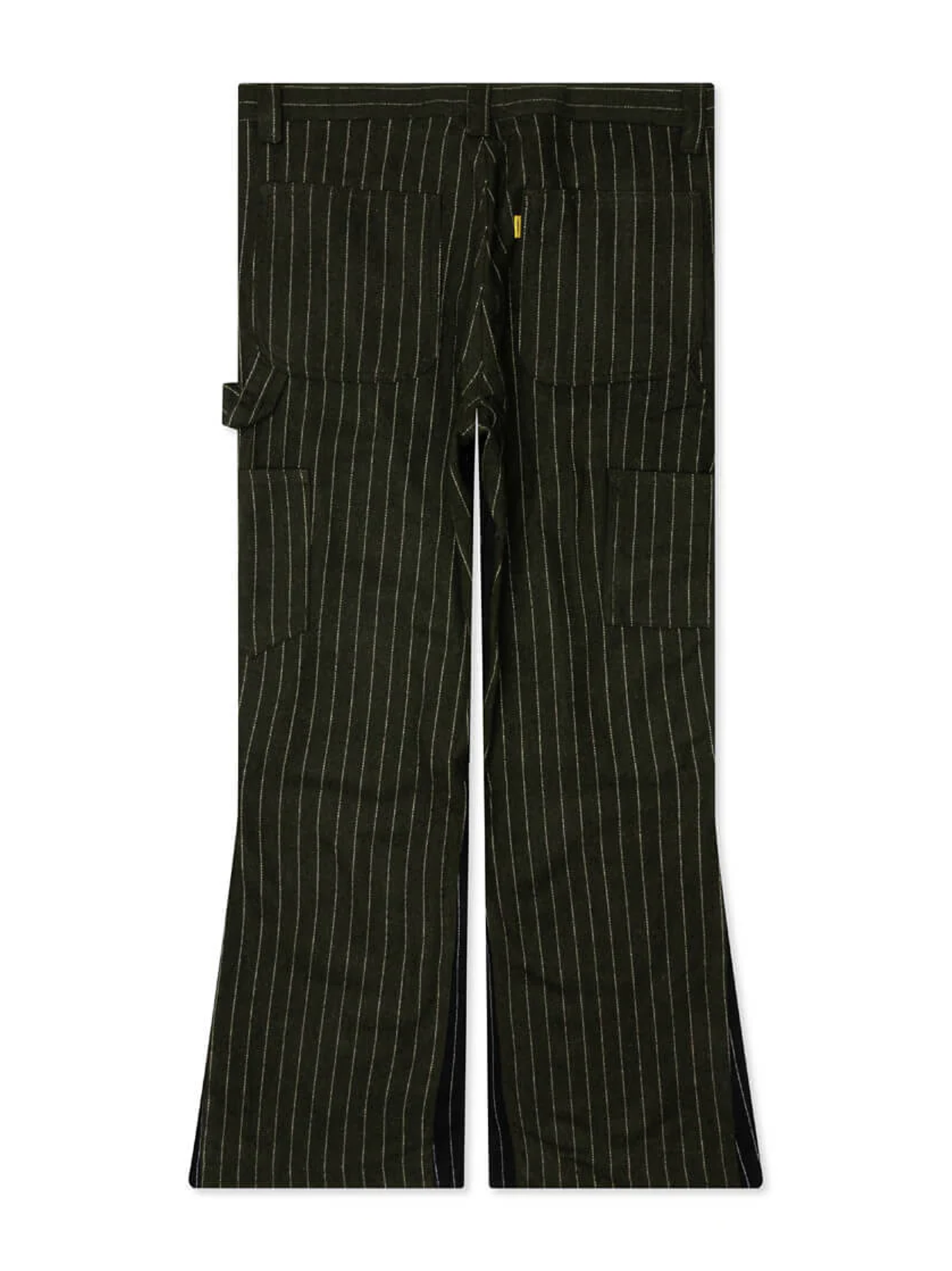 These Gallery Dept Business Carpenter Flare Jeans in Olive offer a relaxed, oversized fit with a subtle flare for effortless style. Crafted from premium wool, they feature a mid-rise waist, belt loops, and a distinctive pinstripe print, combining classic tailoring with contemporary design. Finished with a secure button and zipper closure, these pants deliver both comfort and sophistication for everyday wear.